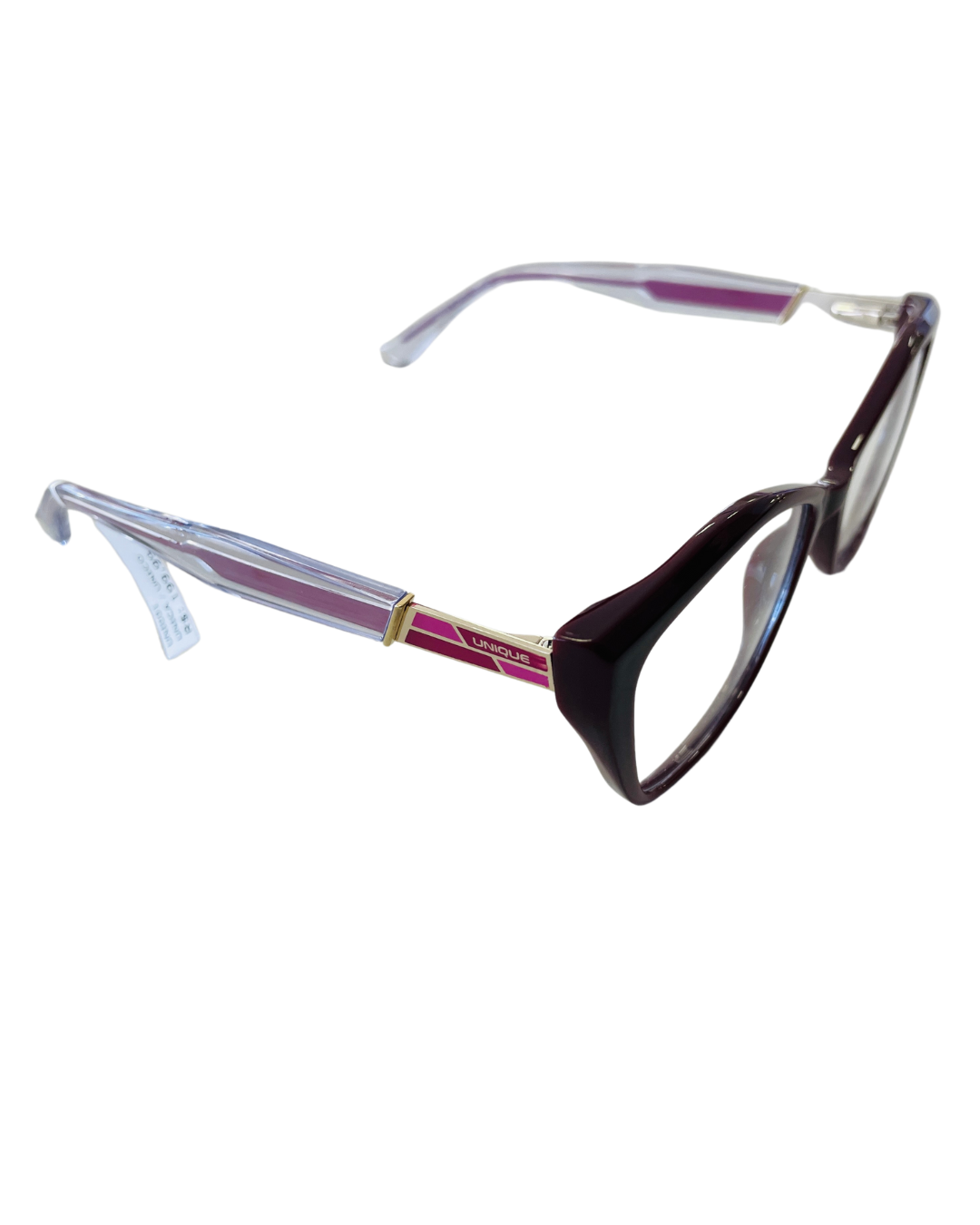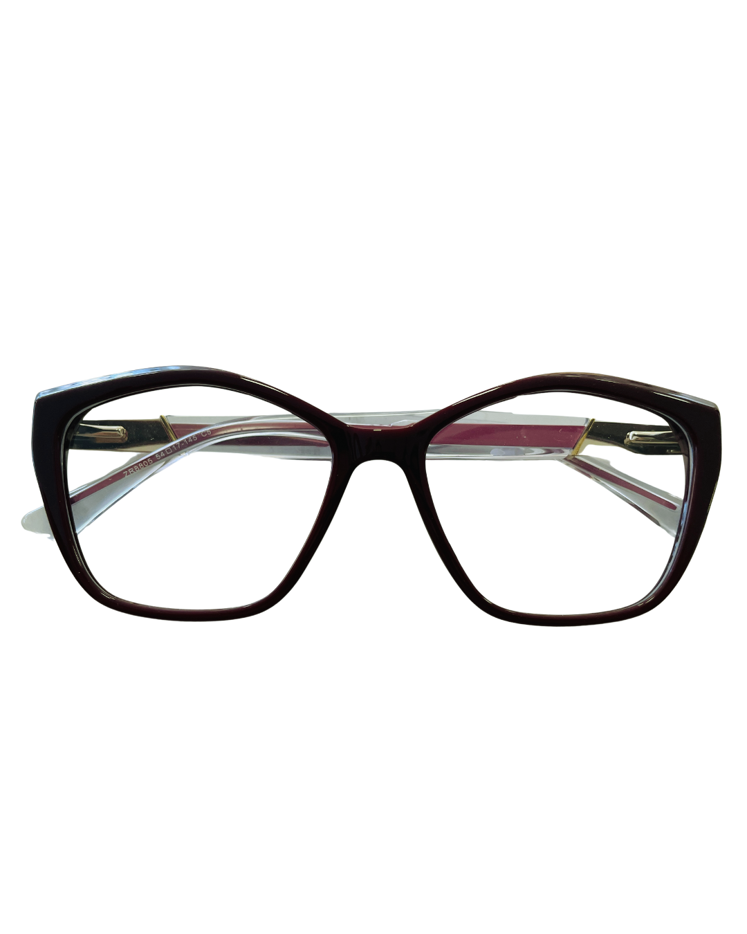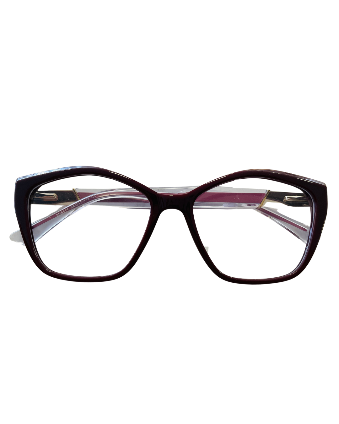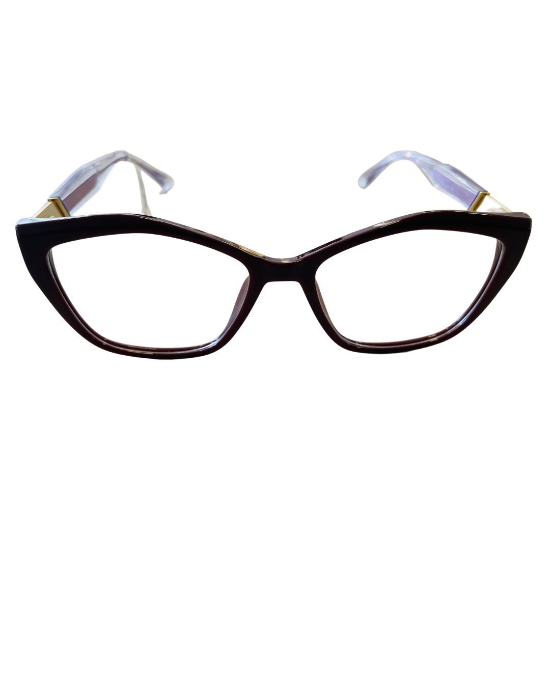 Armação gatinho em tom vinho sofisticado, com hastes claras que trazem leveza e equilíbrio ao design. Ideal para quem busca um visual elegante e moderno, sem abrir mão da delicadeza.