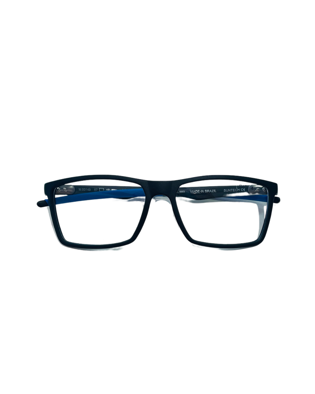 Com armação quadrada preta e hastes internas em azul, esse óculos é moderno e estiloso. Um modelo versátil que transmite personalidade e combina com diferentes ocasiões.