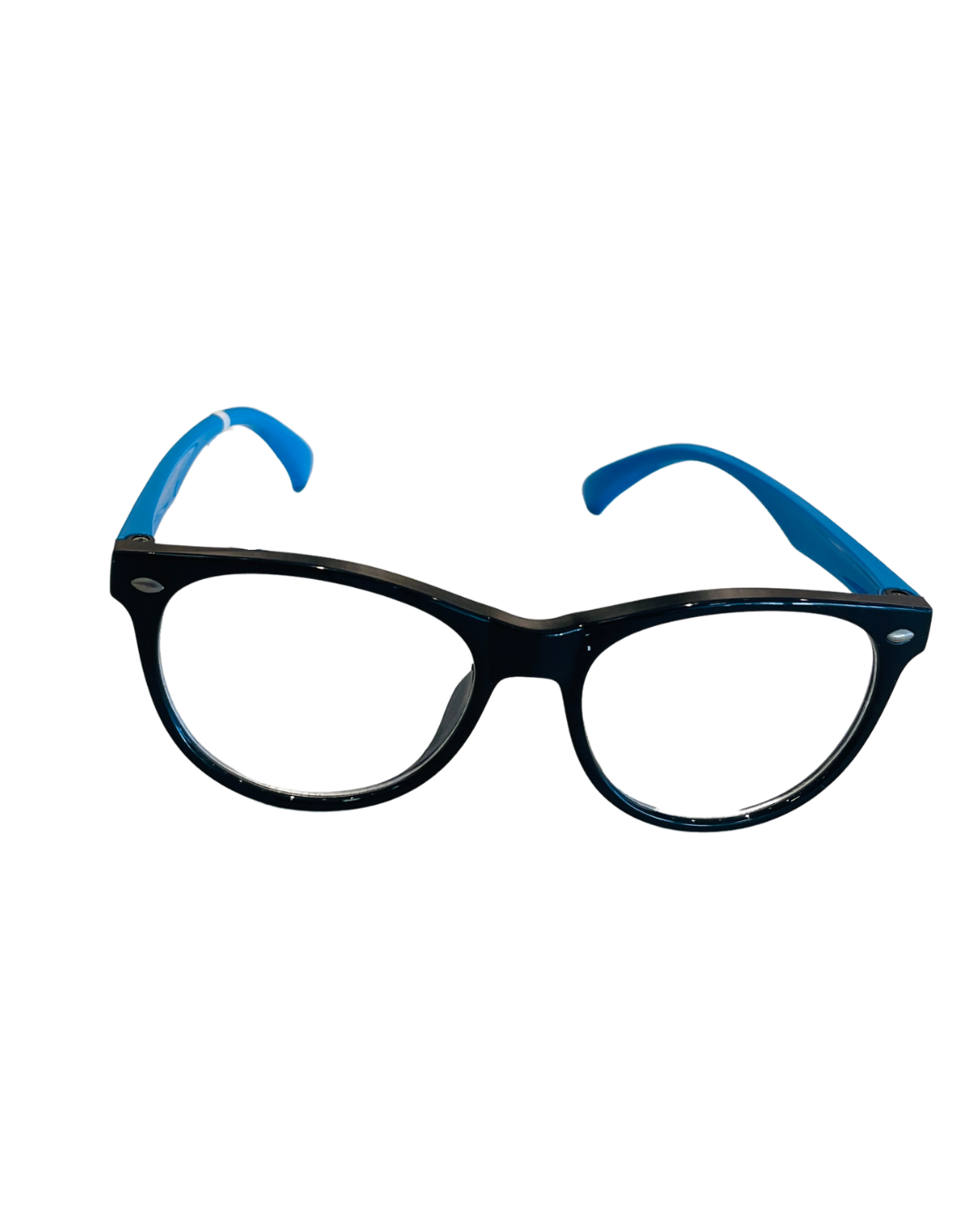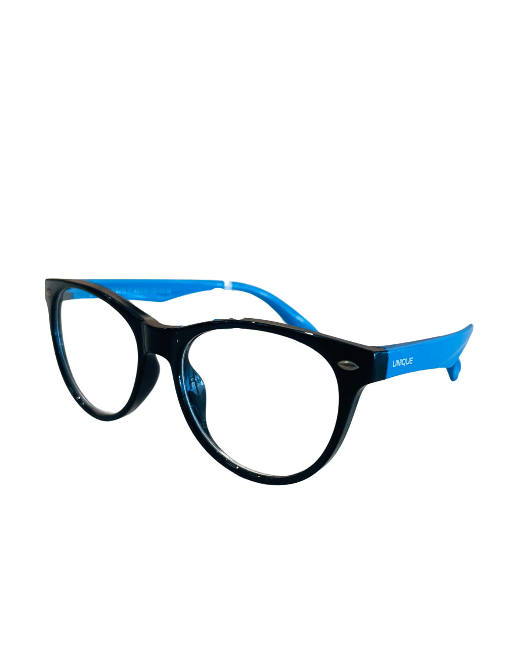 Com armação redonda preta e hastes em azul vibrante, esse óculos combina estilo clássico com um toque moderno e descontraído. Leve e confortável, é ideal para quem busca versatilidade com personalidade.